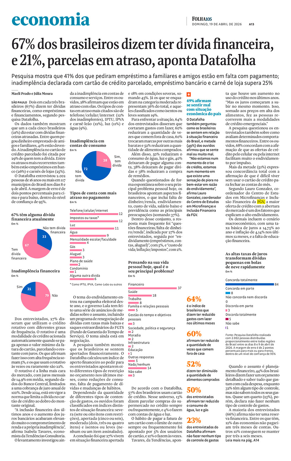 67% dos brasileiros dizem ter dívidas financeiras, e 21%, parcelas em atraso – Folha de S. Paulo