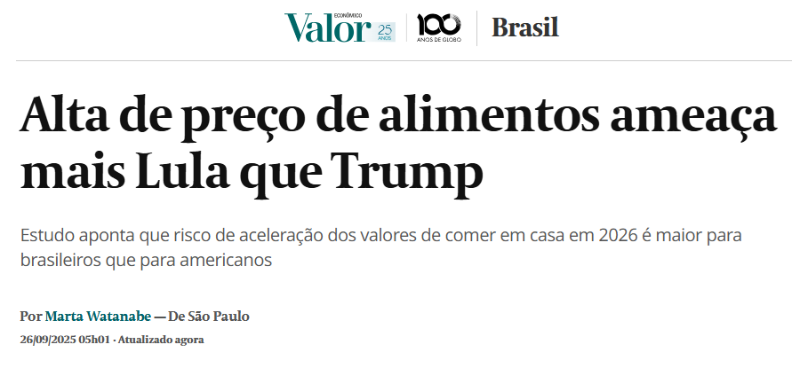 Após forte crescimento entre setembro de 2024 até maio deste ano, os preços da alimentação no domicílio recuam desde junho, na variação mensal. A sensação dos consumidores brasileiros em relação ao preço dos alimentos melhorou no decorrer dos últimos três meses e, segundo pesquisas do período, favoreceu a recuperação da popularidade do presidente Lula. Nos Estados Unidos, ao contrário, a alta no preço dos alimentos vem se acelerando e pesquisas indicam que isso se tornou fonte maior de preocupação para os americanos. Para os próximos meses e para 2026, ano de eleições presidenciais no Brasil, porém, o risco de aceleração de preços na alimentação em casa é maior para os brasileiros do que para os americanos.