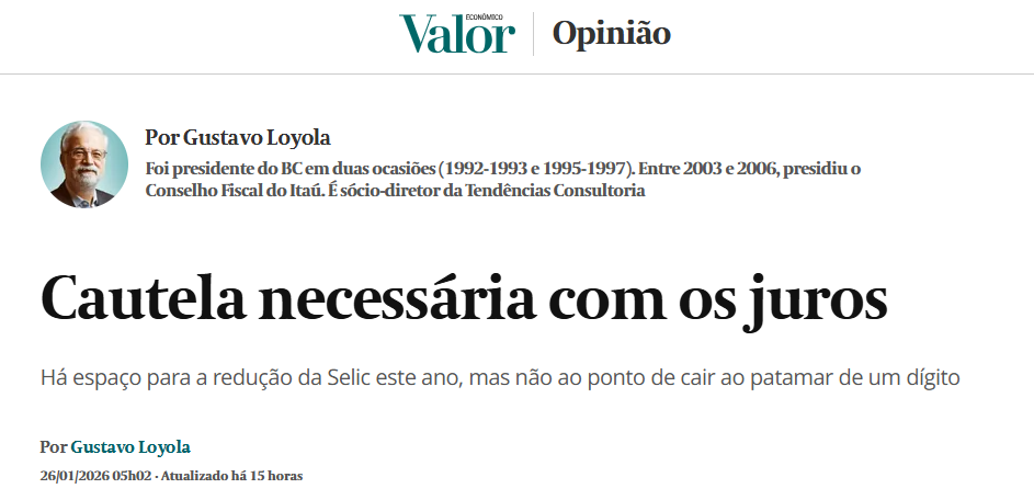 *Gustavo Loyola foi presidente do BC em duas ocasiões (1992-1993 e 1995-1997). Entre 2003 e 2006, presidiu o Conselho Fiscal do Itaú. É sócio-diretor da Tendências Consultoria