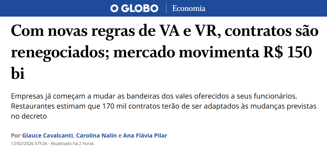 - Prazo menor de pagamento: O decreto também reduziu de 30 dias para 15 dias corridos o prazo máximo que as operadoras de vale-refeição (VR) e vale-alimentação (VA) têm para pagar os estabelecimentos comerciais. Antes, esse prazo era de 30 dias. Esta regra começa a valer em 11 de fevereiro de 2026.