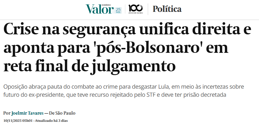 A entrada definitiva do tema da segurança pública no debate eleitoral, com as repercussões da operação policial no Rio de Janeiro que deixou 121 mortos e virou a mais letal da história no país, contribuiu para alinhar atores de oposição que orbitam Jair Bolsonaro, só que agora em torno de uma pauta descolada das prioridades do ex-presidente. O movimento acendeu um alerta no presidente Luiz Inácio Lula da Silva, que sofre desgastes nessa temática e tenta responder à pressão para se reeleger.