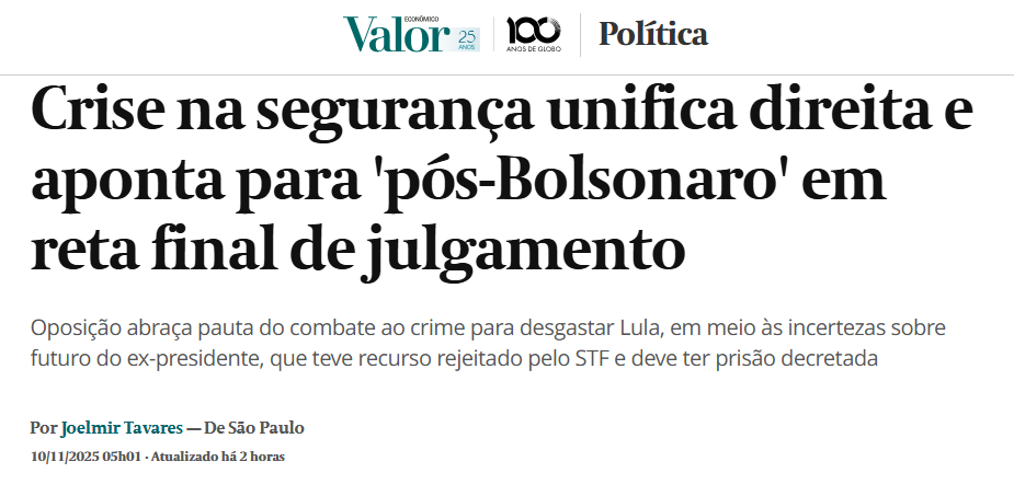 A entrada definitiva do tema da segurança pública no debate eleitoral, com as repercussões da operação policial no Rio de Janeiro que deixou 121 mortos e virou a mais letal da história no país, contribuiu para alinhar atores de oposição que orbitam Jair Bolsonaro, só que agora em torno de uma pauta descolada das prioridades do ex-presidente. O movimento acendeu um alerta no presidente Luiz Inácio Lula da Silva, que sofre desgastes nessa temática e tenta responder à pressão para se reeleger.