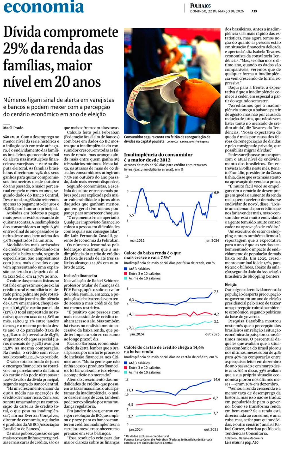 Dívida compromete 29% da renda das famílias, maior nível em 20 anos – Folha de S. Paulo