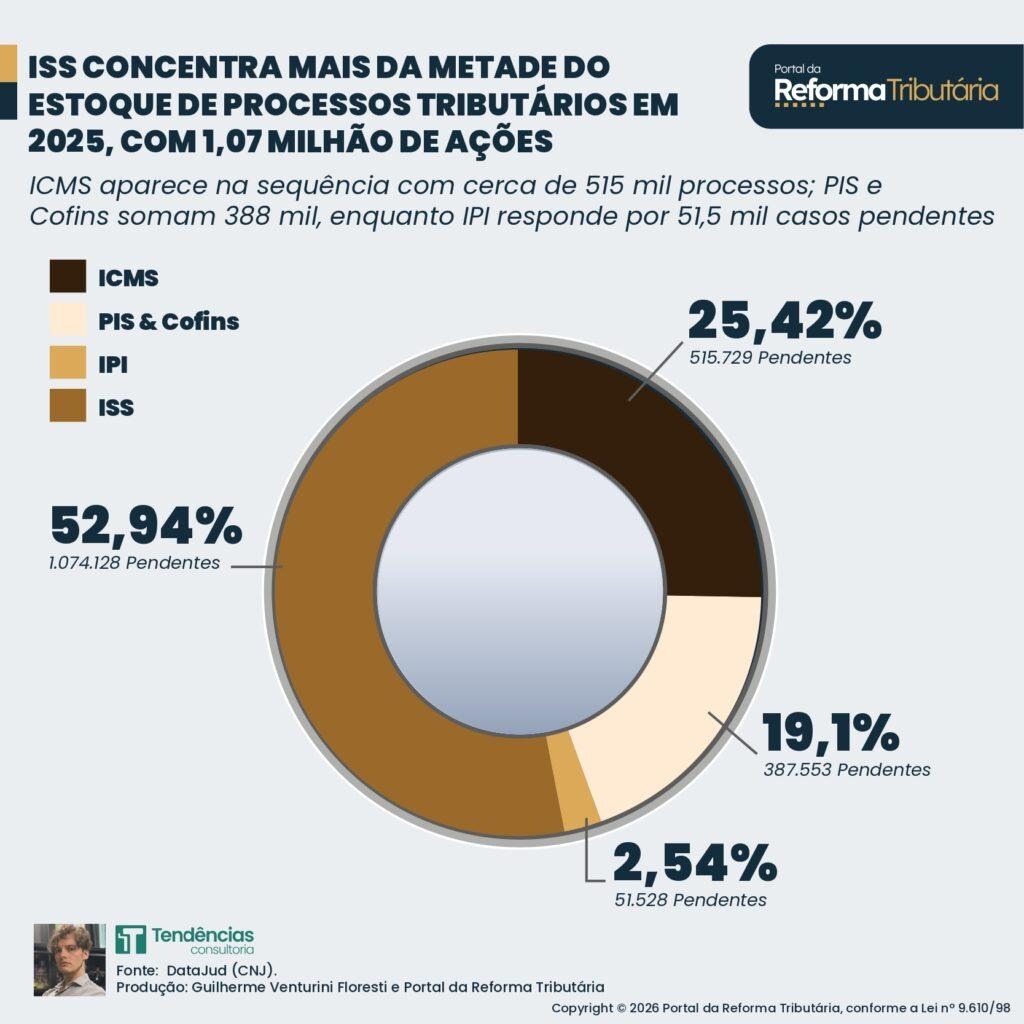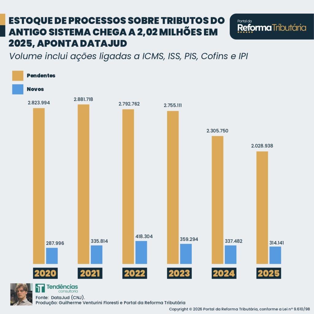 Por meio de dados do DataJud, é possível estimar o estoque de processos ligados a ICMS, ISS, PIS, Cofins e IPI. Partindo de um exercício conservador, estima-se um volume de cerca de 2,02 milhões ao final de 2025, sendo que no ano ingressaram cerca de 314 mil novas ações de tributos sobre o consumo. Apesar de ainda grande, esse estoque de processos está em queda desde 2021:
