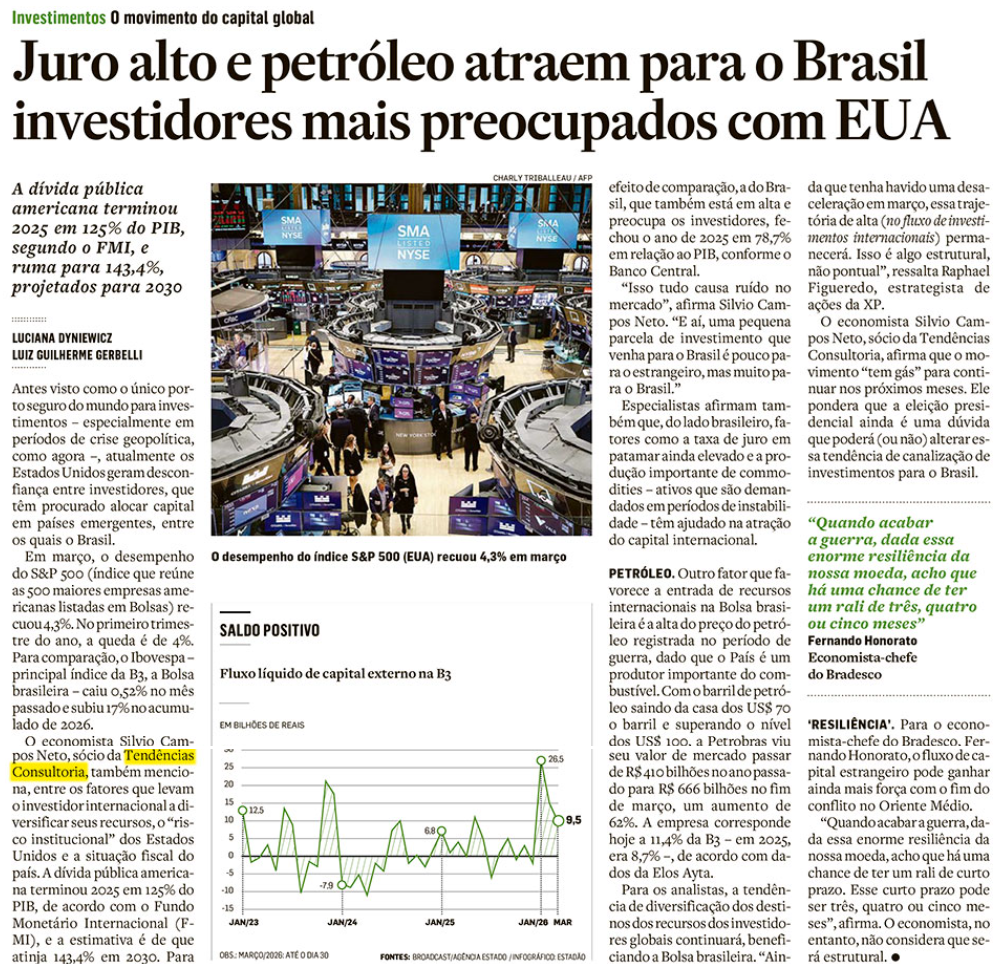 Outro fator que favorece a entrada de recursos internacionais na Bolsa brasileira é a alta do preço do petróleo registrada no período de guerra, dado que o País é um produtor importante do combustível. Com o barril de petróleo saindo da casa dos US$ 70 o barril e superando o nível dos US$ 100. a Petrobras viu seu valor de mercado passar de R$ 410 bilhões no ano passado para R$ 666 bilhões no fim de março, um aumento de 62%. A empresa corresponde hoje a 11,4% da B3 – em 2025, era 8,7% -, de acordo com dados da Elos Ayta.