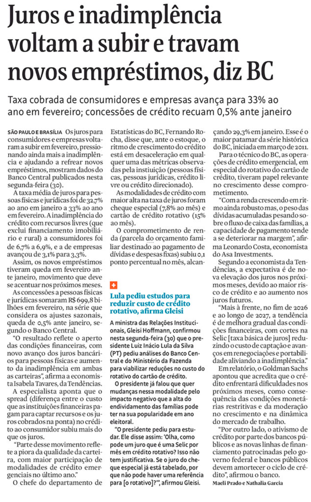 A taxa média de juros para pessoas físicas e jurídicas foi de 32,7% ao ano em janeiro para 33% ao ano em fevereiro. A inadimplência do crédito com recursos livres (que exclui o financiamento imobiliário e rural) a consumidores passou de 6,7% a 6,9%, e a de empresas avançou de 3,1% para 3,3%.