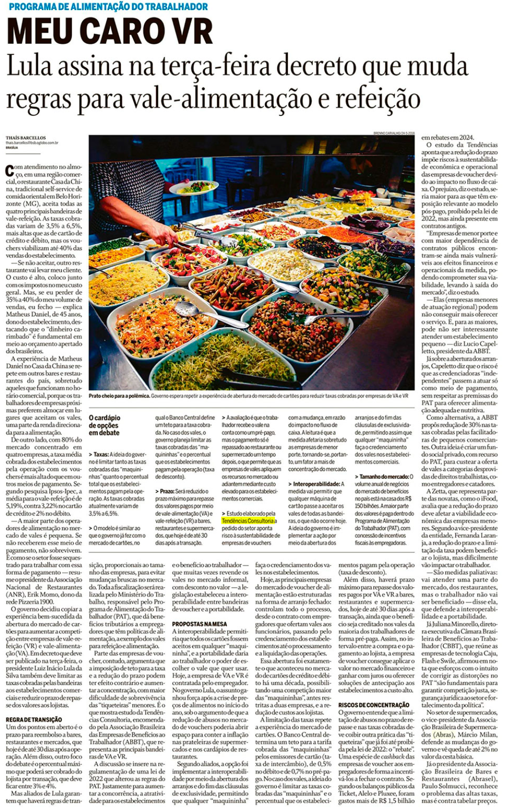 Com atendimento no almoço, em uma região comercial, o restaurante Casa da China, tradicional self-service de comida oriental em Belo Horizonte (MG), aceita todas as quatro principais bandeiras de vale-refeição. As taxas cobradas variam de 3,5% a 6,5%, mais altas que as de cartão de crédito e débito, mas os vouchers viabilizam até 40% das vendas do estabelecimento.