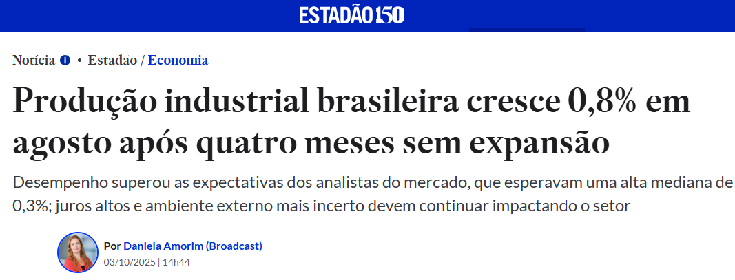RIO – A despeito da política monetária contracionista e da entrada em vigor do tarifaço norte-americano contra exportadores brasileiros, a produção industrial nacional cresceu 0,8% em agosto ante julho, segundo os dados da Pesquisa Industrial Mensal, divulgados nesta sexta-feira, 3, pelo Instituto Brasileiro de Geografia e Estatística (IBGE).