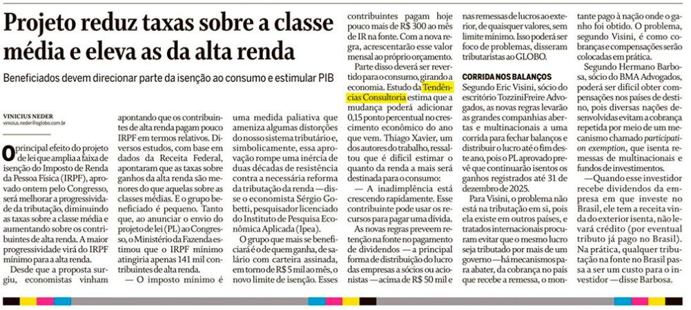 Parte desse alívio deverá ser revertido para o consumo, girando a economia já em 2026. Um estudo da Tendências Consultoria estima que a ampliação da isenção poderá elevar de 1,8% (média das previsões captadas pelo Boletim Focus, do BC ) para 2,0% o crescimento do PIB em 2026.