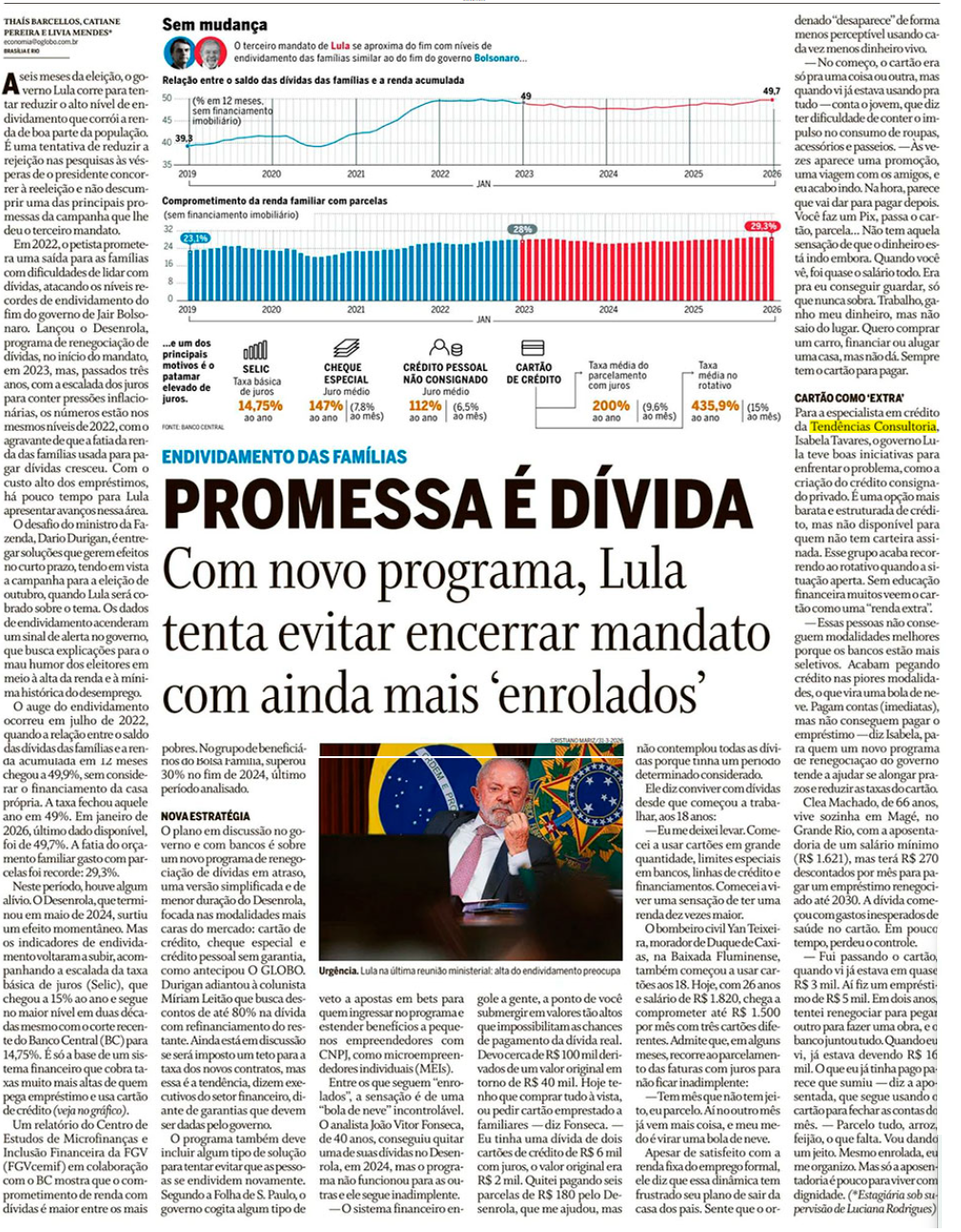 E com um agravante: a fatia da renda das famílias usada para pagar dívidas cresceu. Com o custo alto dos empréstimos, há pouco tempo para Lula apresentar avanços nessa área.