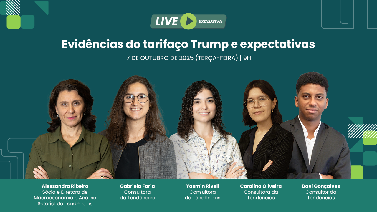 Visando discutir os primeiros efeitos do tarifaço e as perspectivas para os setores, bem como o espaço ainda existente para negociação entre os dois governos, a Tendências Consultoria realizou uma live no dia 7 de outubro de 2025. Participaram Alessandra Ribeiro, sócia e diretora de Macroeconomia e Análise Setorial da Tendências, e os consultores Gabriela Faria, Yasmin Riveli, Carolina Oliveira e Davi Gonçalves.