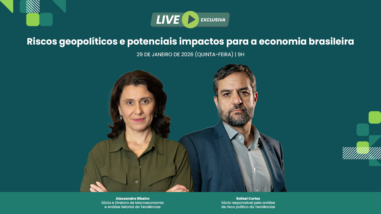 Com o objetivo de avaliar de forma mais aprofundada o atual cenário geopolítico e seus possíveis desdobramentos para o Brasil, a Tendências realizou, no dia 29 de janeiro de 2026, uma live exclusiva que contou com as participações de Alessandra Ribeiro, sócia e diretora da área de Macroeconomia e Análise Setorial da Tendências, e Rafael Cortez, sócio responsável pela análise de risco político da Tendências.