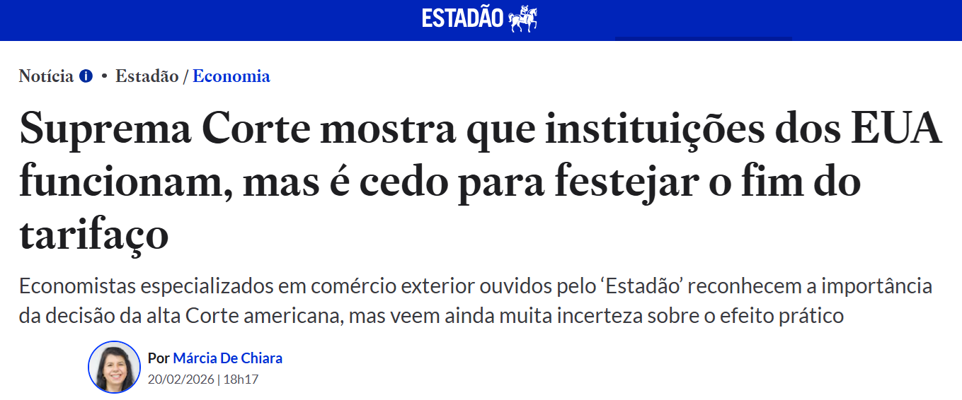 A decisão da Suprema Corte dos Estados Unidos de anular as tarifas globais recíprocas impostas pelo governo de Donald Trump sob uma lei de poderes de emergência mostra que as instituições americanas estão funcionando e reagiram à agenda arbitrária do governo americano, afirmam economistas especializados em comércio exterior ouvidos pelo Estadão. No entanto, ainda é cedo para o mundo comemorar o fim do tarifaço, eles ponderam.