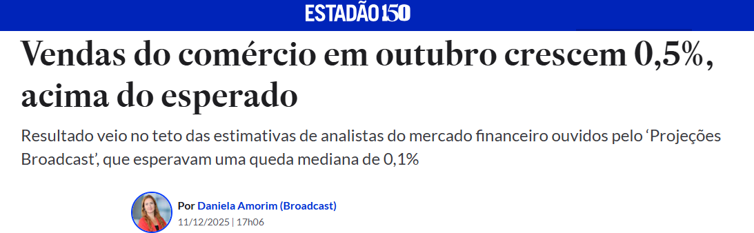 Ele lembra que, em outubro de 2025, as vendas de farmacêuticos operavam em patamar recorde, enquanto as de supermercados estavam apenas 1,3% abaixo do pico de maio de 2024. A sobra de renda do consumidor para além do essencial estaria sendo direcionada para a aquisição de bens não essenciais em outros segmentos varejistas.